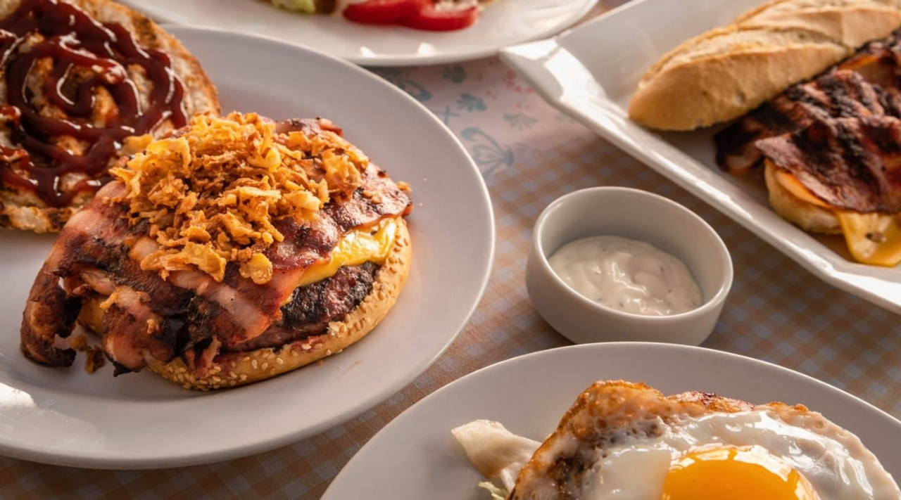 Hamburguesa mixta con lechuga, tomate, cebolla, queso, bacon y huevo y hamburguesa de pollo con lechuga y mayonesa