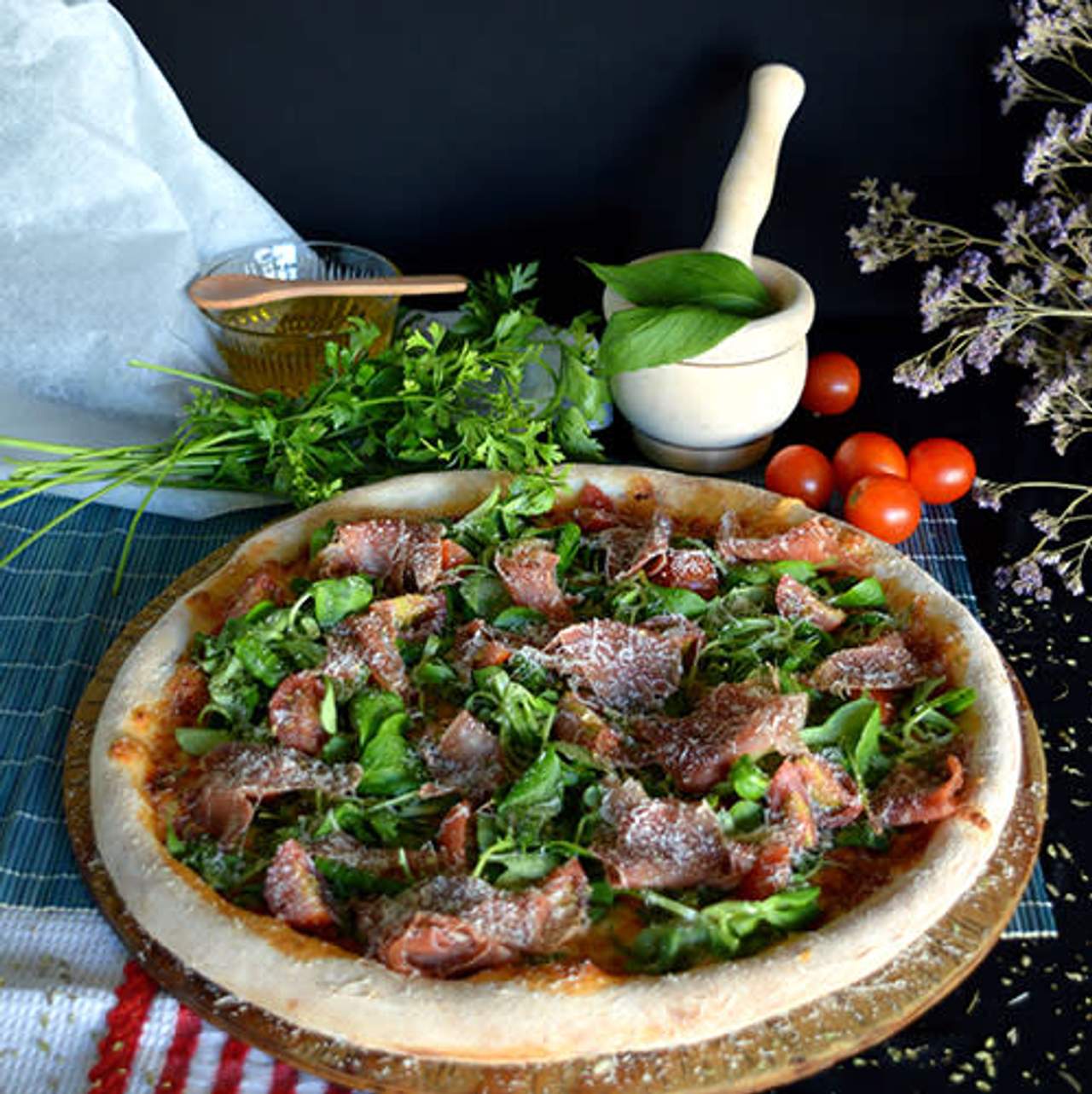 Tomate, mozzarella, rúcula, jamón, tomate fresco, parmesano, orégano