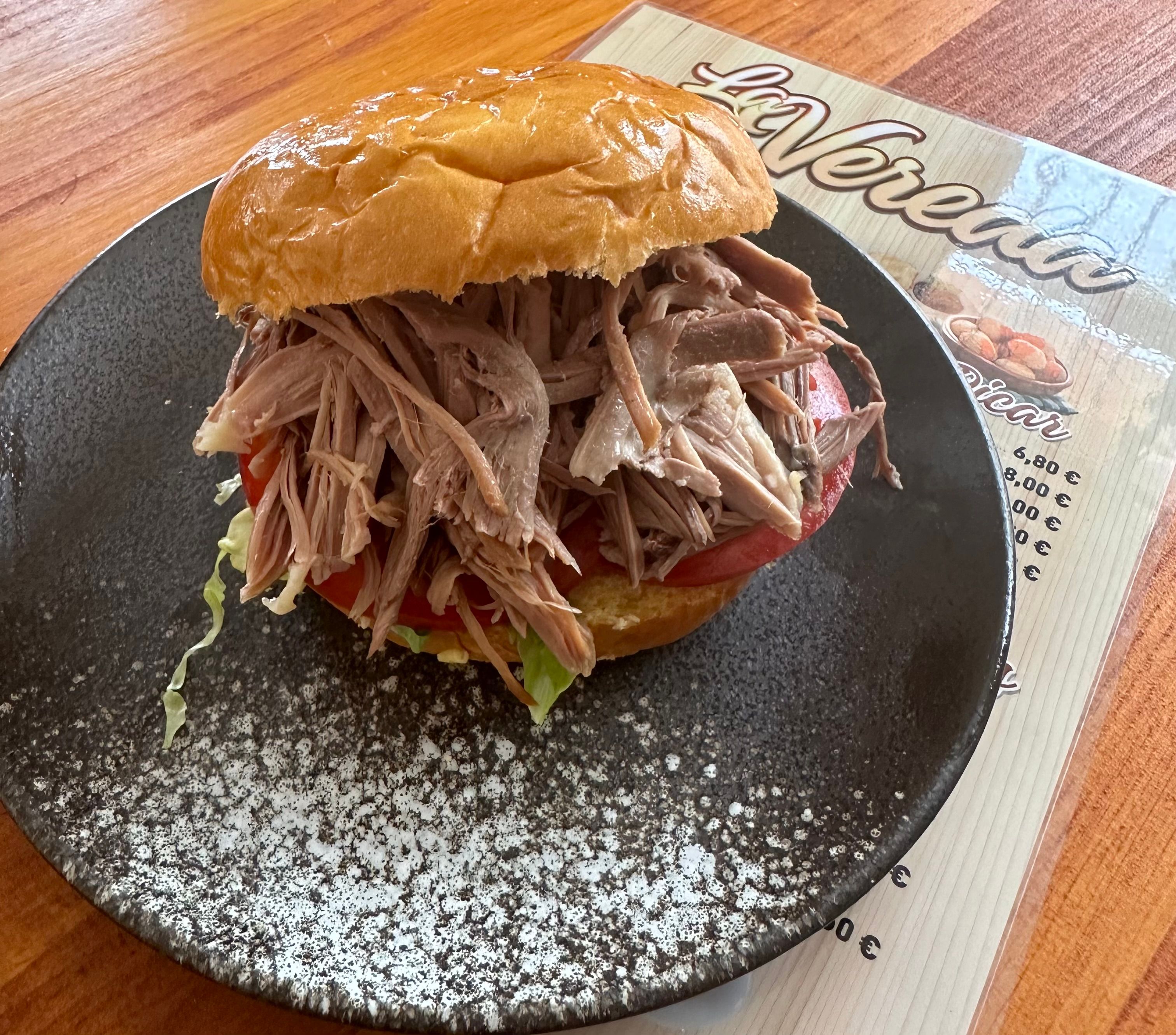 Pan brioche con cerdo asado, lechuga, tomate y majao de la casa