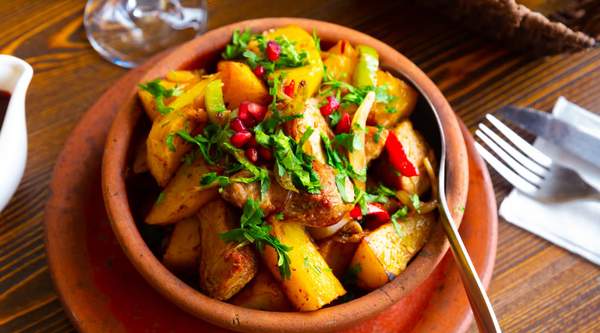 კარტოფილი, საქონლის ხორცი, სოკო, ყველი, მაიონეზი, მზესუმზირას ზეთი, პომიდორი, წიწაკა, მარილი