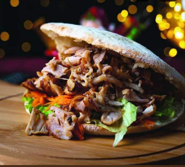 ღორის ხორცი, სალათის ფოთოლი, წიწაკა, ხახვი, მაიონეზი, კეტჩუპი, პომიდორი, ლავაში