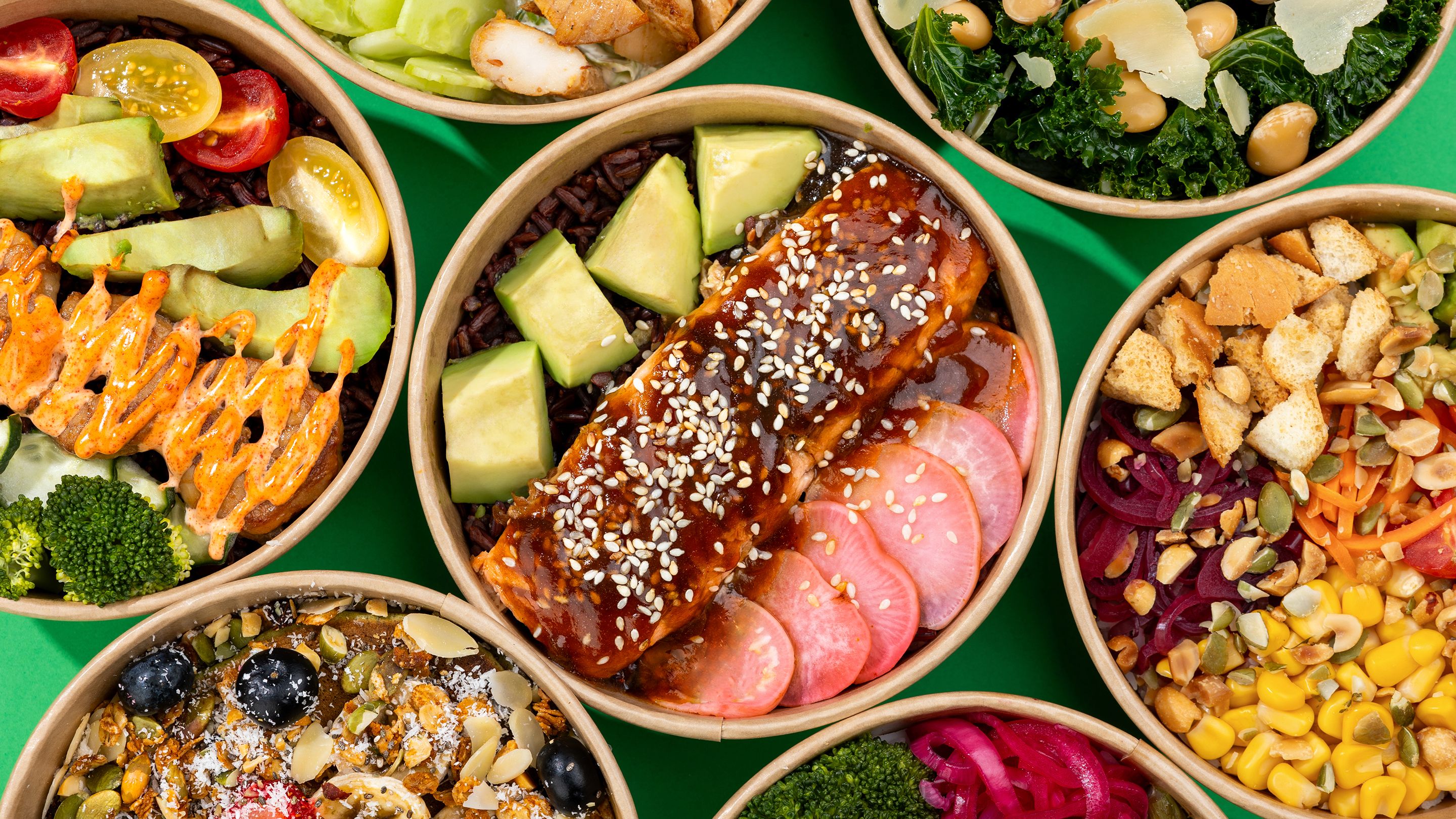 ინგრედიენტები : ბრინჯი, სიმინდის მარცვალი, ავოკადო, ჩერი პომიდორი, დამარინადებული სტაფილო, დამარინადებული წითელი ხახვი, მიწისთხილი, გოგრის მარცვალი, ტაჰინი იოგურტის სოუსი, კრუტონები. 486.5 კალორია ცილა: 16.7 გრ ცხიმი: 16.4 გრ ნახშირწყლები: 74.6 გრ