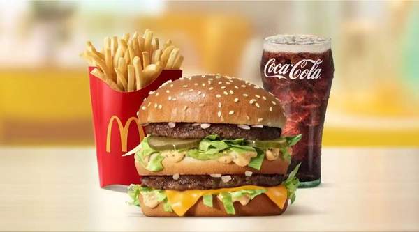 მადისაღმძვრელი გრანდ ბიგ მაკი, 2 ცალი 100% საქონლის ხორცით, უგემრიელეს, სეზამის მარცვლებიან ფუნთუშაში, 2 მდნარი ყველით, დეჰიდრირებული ხახვით, სალათი აისბერგით, მჟავე კიტრით და განუმეორებელი ბიგ მაკ სოუსით, ფრი, სასმელი