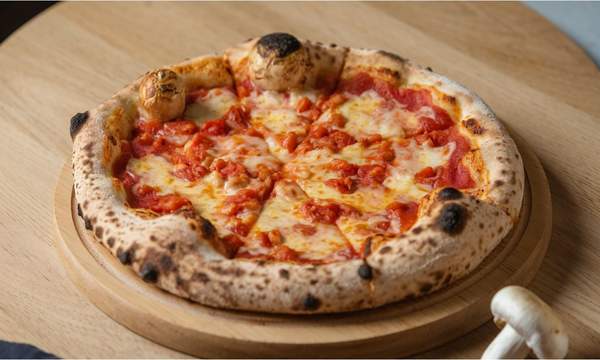 Pomodoro fior di latte, salame piccante, prosciutto cotto svizzero, funghi, mollica, origano