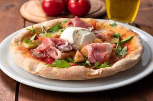 Sugo, mozzarella di bufala, prosciutto crudo, rucola, grana, pomodorini
