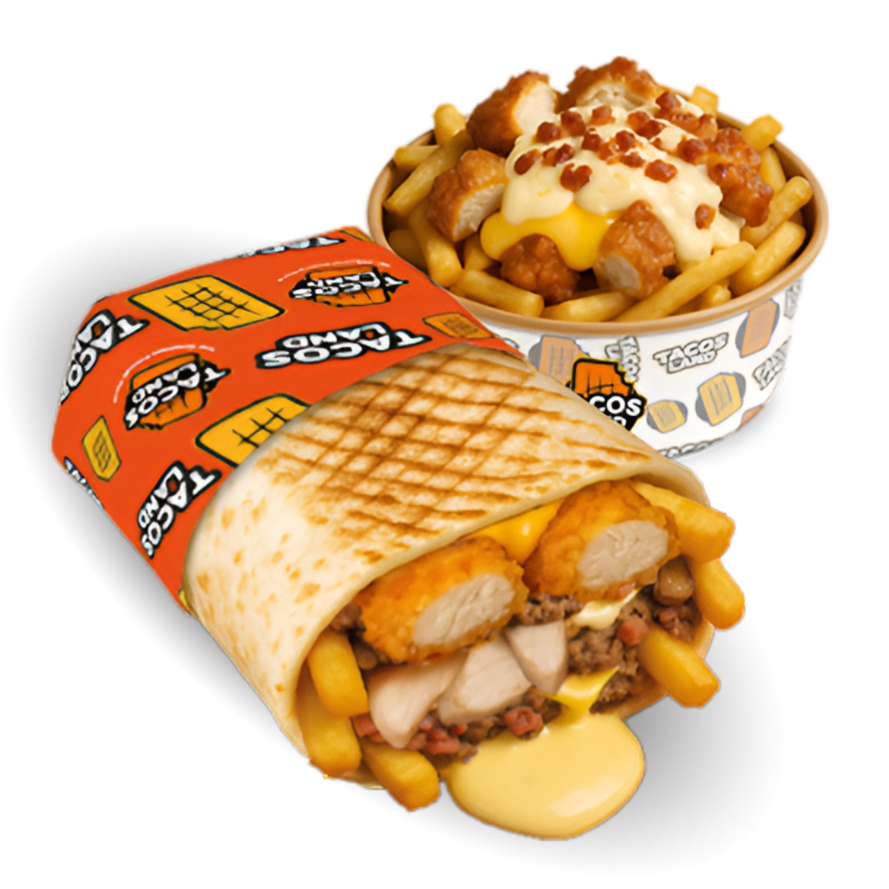 TACOS ( salsa brazil,pollo condito,patatine,salsa gruyère,Emmental gratinato e Bacon di manzo