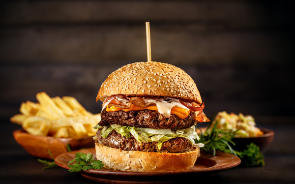 Classic bun, patty di manzetta scottona 180 g, maionese, insalata, pomodoro, pepper white sauce, doppio cheddar, doppia cipolla rossa caramellata, doppio bacon, doppio jalapejno, meat m'ama bbq whisky sauce.