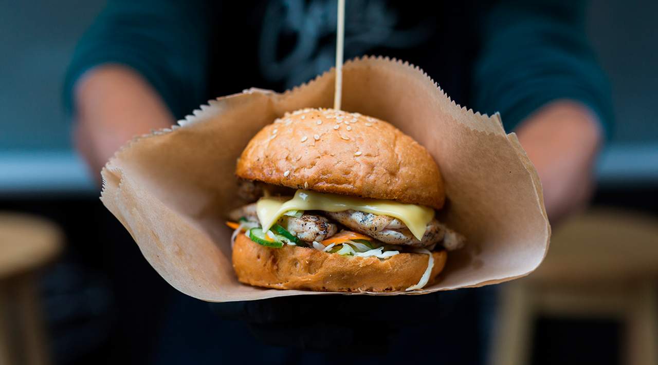 Burger di pollo, insalata, bacon, doppio formaggio, pomodoro, cipolla, cetriolini, senape al miele