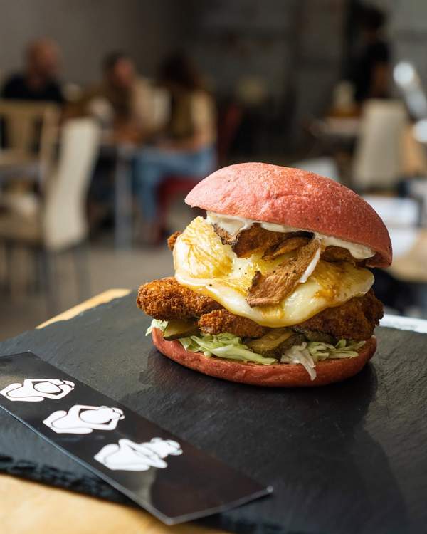 Cotoletta di pollo, provola affumicata, rucola, maionese , patatine
