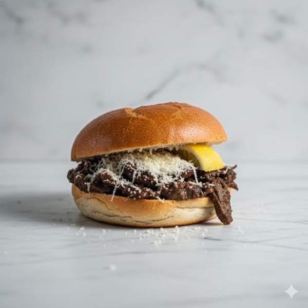 Hamburger di manzo, cheddar, lattuga, pomodoro. cipolla caramellata, uovo, salsa umberto Patatine