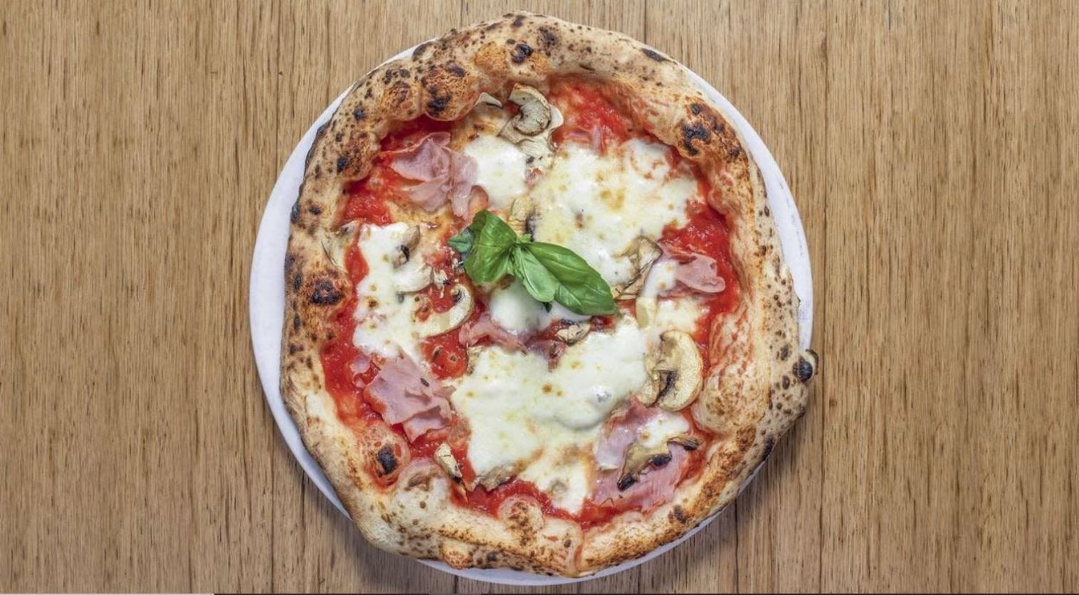 Pomodoro, mozzarella, carciofini, olive, prosciutto e funghi