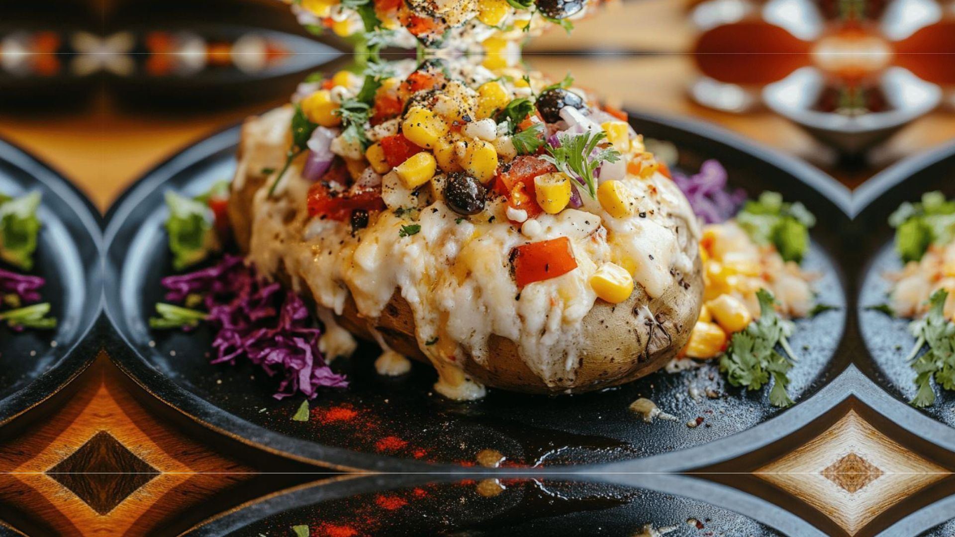 Pomme de terre, hot-dog, salade olivier, oignon crispy, fromage