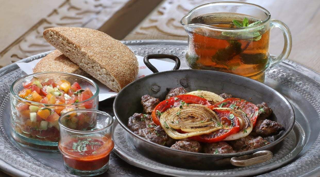 Kefta en provenance dune race de bœuf endémique du Maroc, la Brune de lAtlas, qui continue à se nourrir librement dans les forêts de la région Oulmès. Servie accompagnée de tomates et oignons grillés au feu de bois. Pain moojood au choix