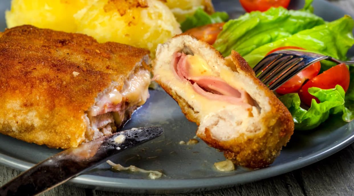 Cordon Bleu, tomates, laitues, maïs, sauce blanche, Servi avec frites Servi avec frites