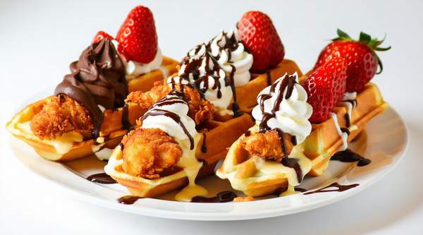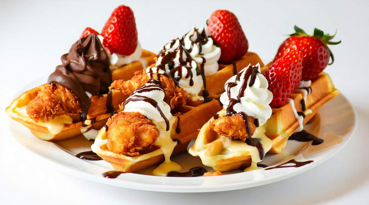 Mini pancakes/waffles, loaded with chicken and cheese, with a side sauce