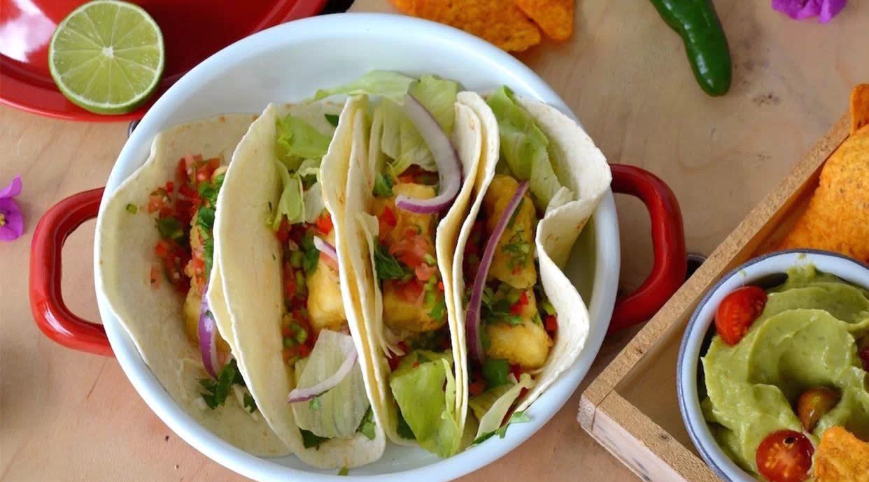 Kawałki mięsa wieprzowego marynowane w mieszance przypraw z papryką i cebulą, podawane z tortillami pszennymi i sosami śmietanowym, czosnkowym i salsą pomidorową.