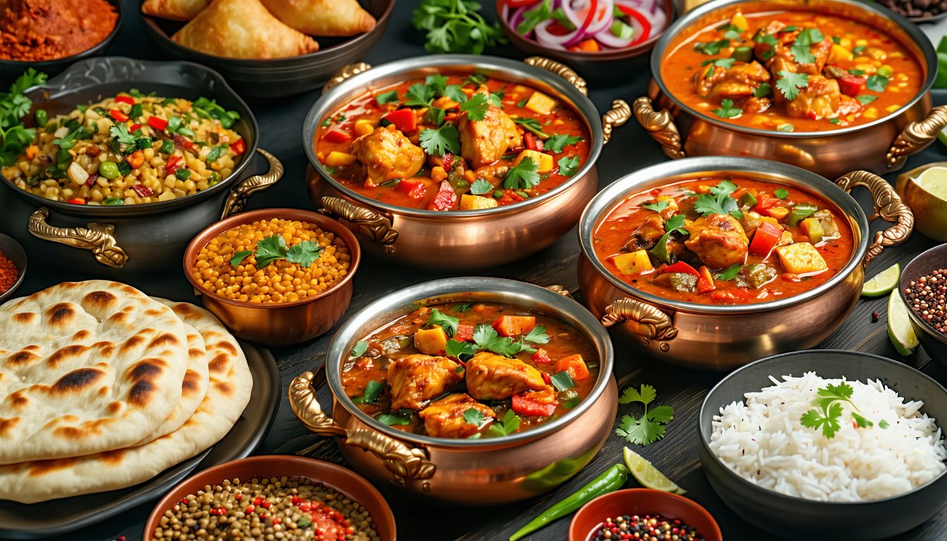 Kawałki kurczaka z mieszanką warzyw w sosie curry gotowane w indyjskim garnku