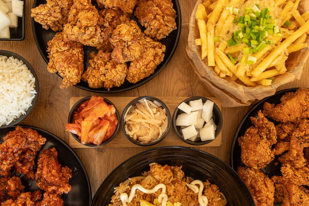 Duża porcja chrupiącego koreańskiego kurczaka z miodowym dipem