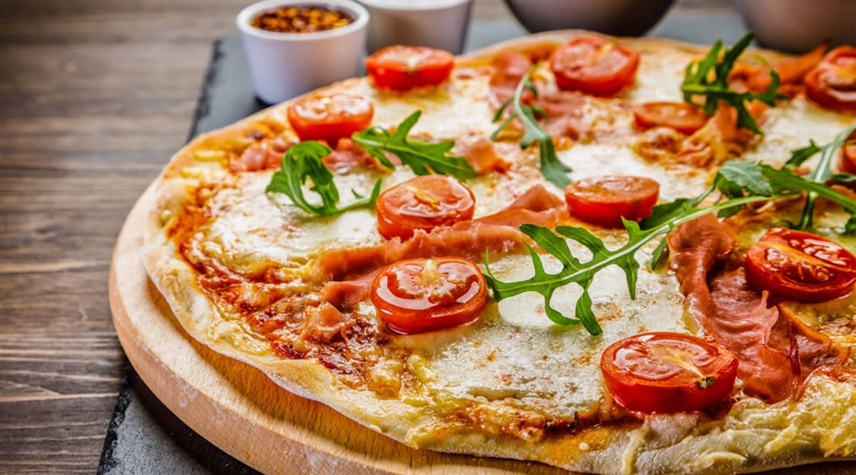 Szynka parmeńska, sos pomidorowy, mozzarella, rukola, parmezan, oregano.