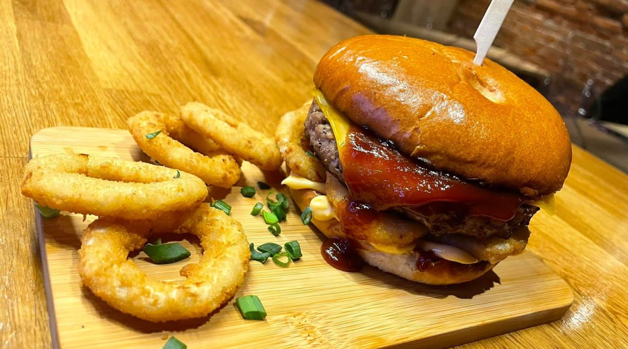 Brioche grillowana na maśle, wołowina smash 2x smażona, karmelizowana cebulka, bekon, ser, ogórek konserwowy