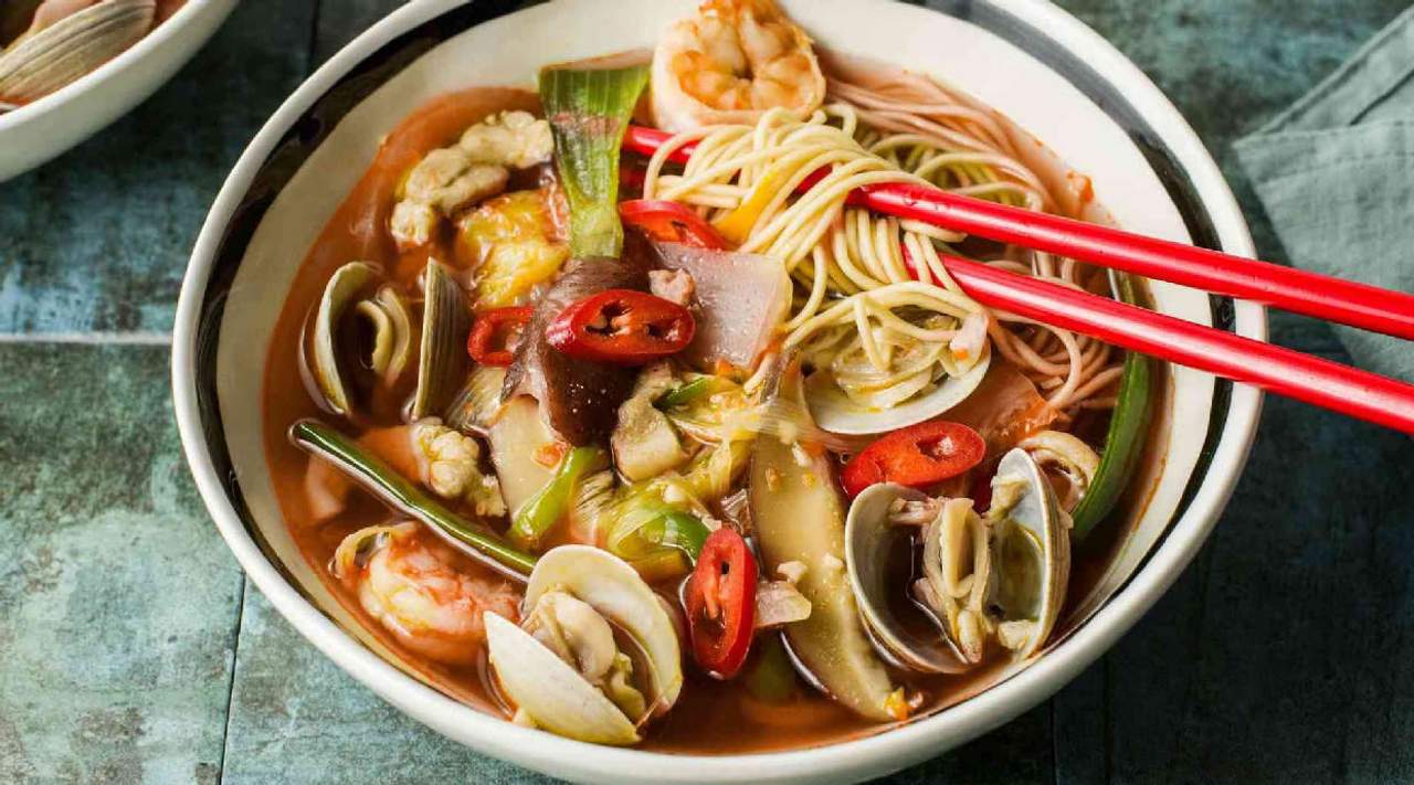 Vegetarianos, frango, porco, vaca, camarão ou mix no wok com macarrão frito, vegetais misturados e tofu.