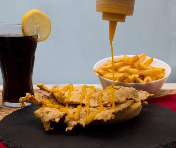 Lombo de Porco Suculento (Batido Manualmente) com Queijo, Bacon e Ovo Estrelado e um Delicioso Pão Fresco Torrado