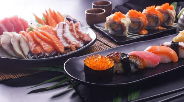 Tartaro de salmão e fruta, tempura de legumes, tataki atum, sashimi salmão, tempura de gambas, rebentos de ervilha, teriyaki e molho sweet chili