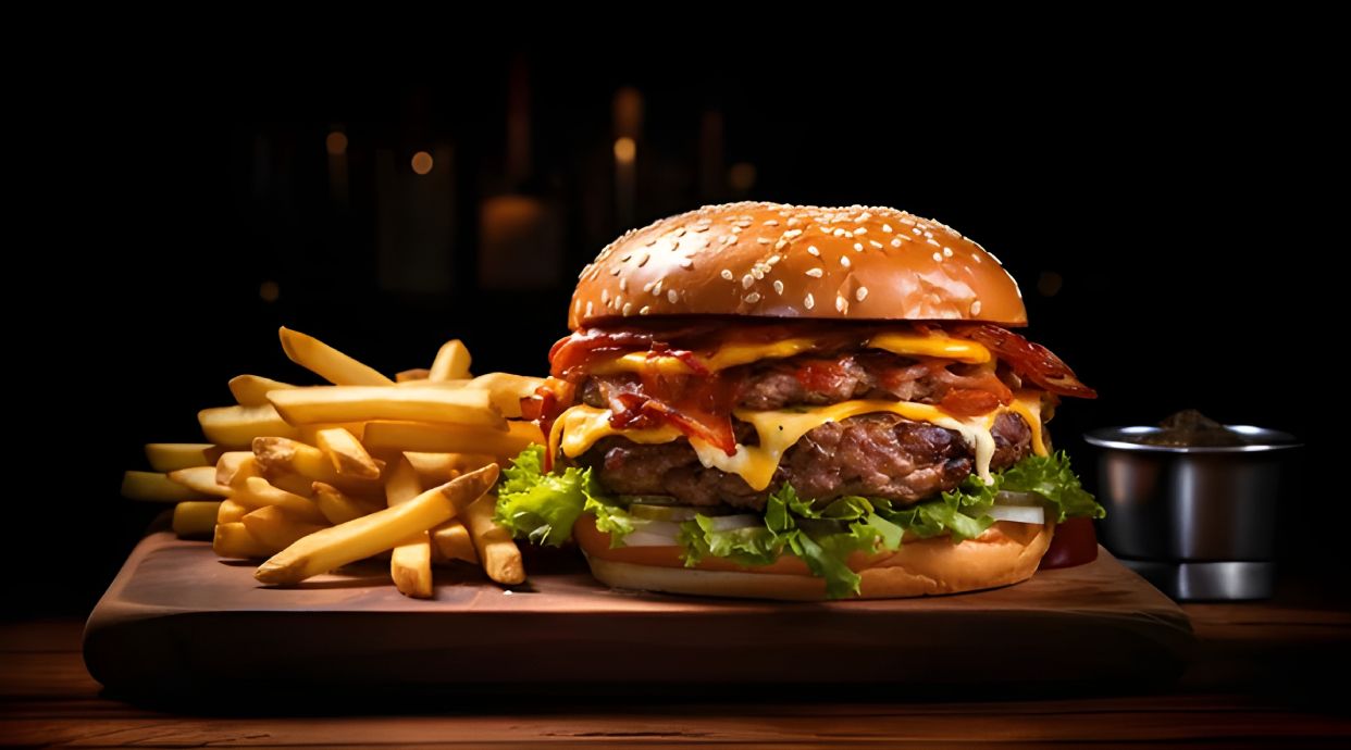 Pão Brioche Com 2 Fatias Carne de Vaca Ou Frango Ou Veggie Smash, 2 Fatias de Queijo Cheddar, Bacon Duplo Grilado, Picles, Alface, Tomate, Cebola Frita Crocante é Molho especial de Casa.