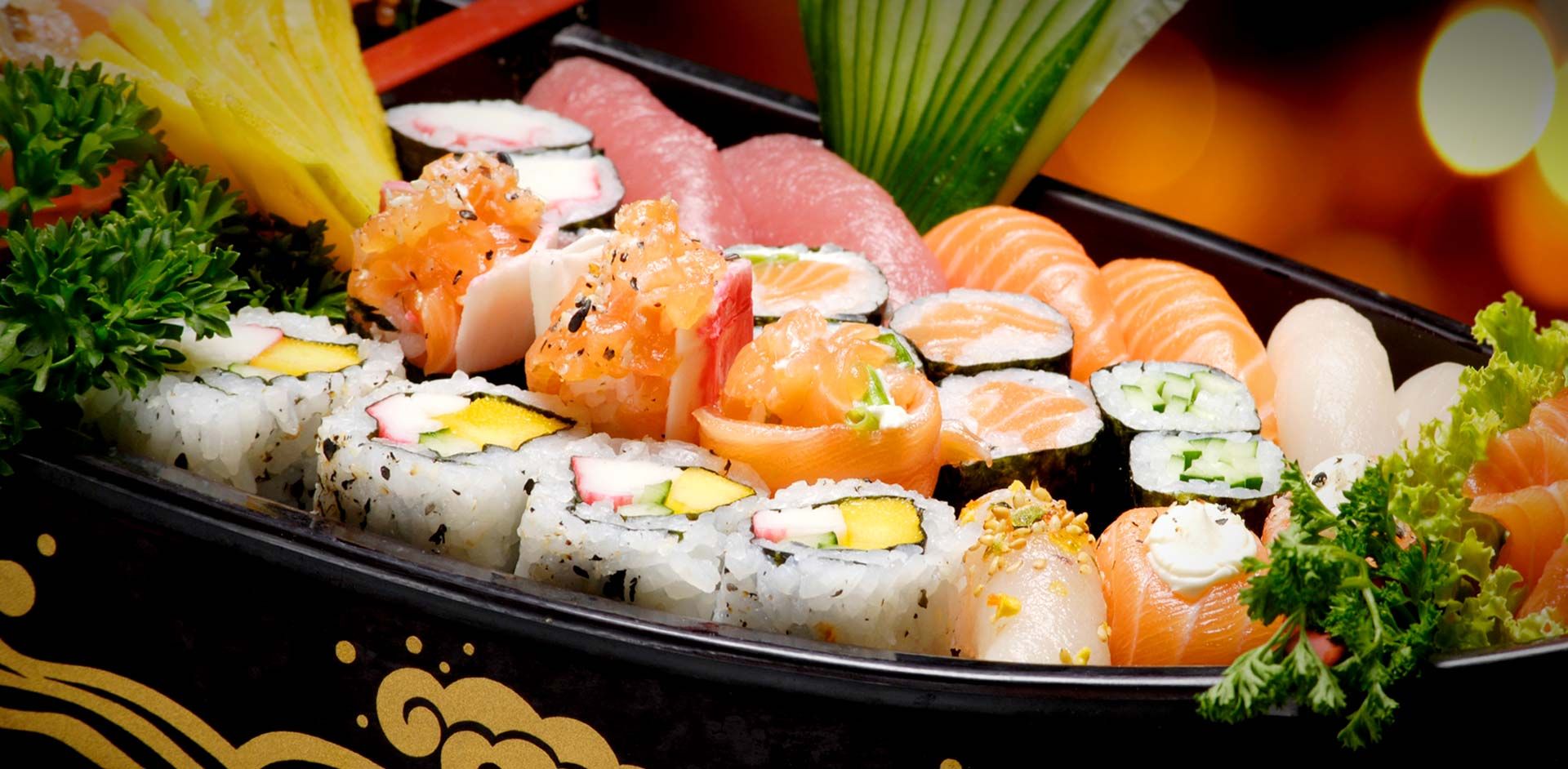 Roll de arroz com salmão, cream cheese e cebolete. Porções de 10 peças