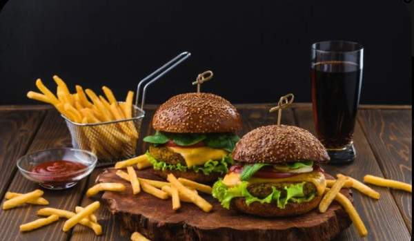 Burger, cartofi prăjiți + băutură răcoritoare - 550g