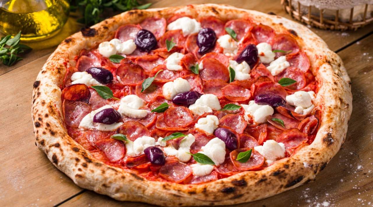 Pizza Pepperoni 1000 gr Blat 540gr Sos roșii 120 gr Cașcaval 100 gr Ardei gogoșari 15gr Salam picant 250 gr Ardei iute 15 gr