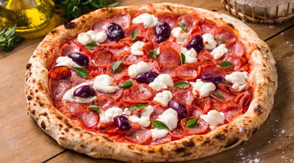 Pizza Salami 1100 gr Blat 540 gr Sos roșii 120 gr Cașcaval 140 gr Salam 100 gr Șuncă presată 100 gr Ciuperci 100 gr