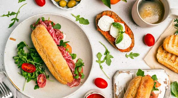 Chifla, salam, cascaval, salate, cartofi prajiti, sosuri - 300g
