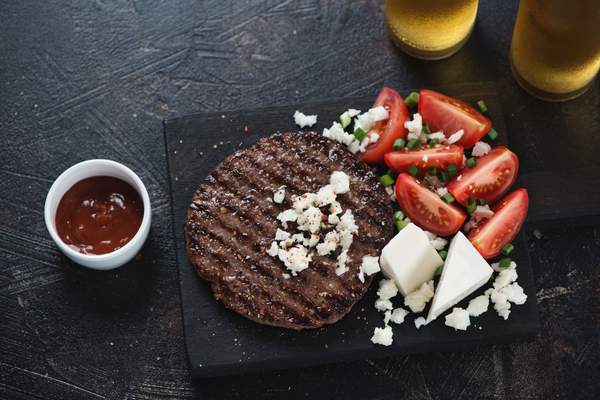 Carne mix porc-vita umpluta cu sunca si cascaval, chifla, salata de varza, ceapa, castraveti proaspeti, rosii, crema de branza, sos tartar - 430g