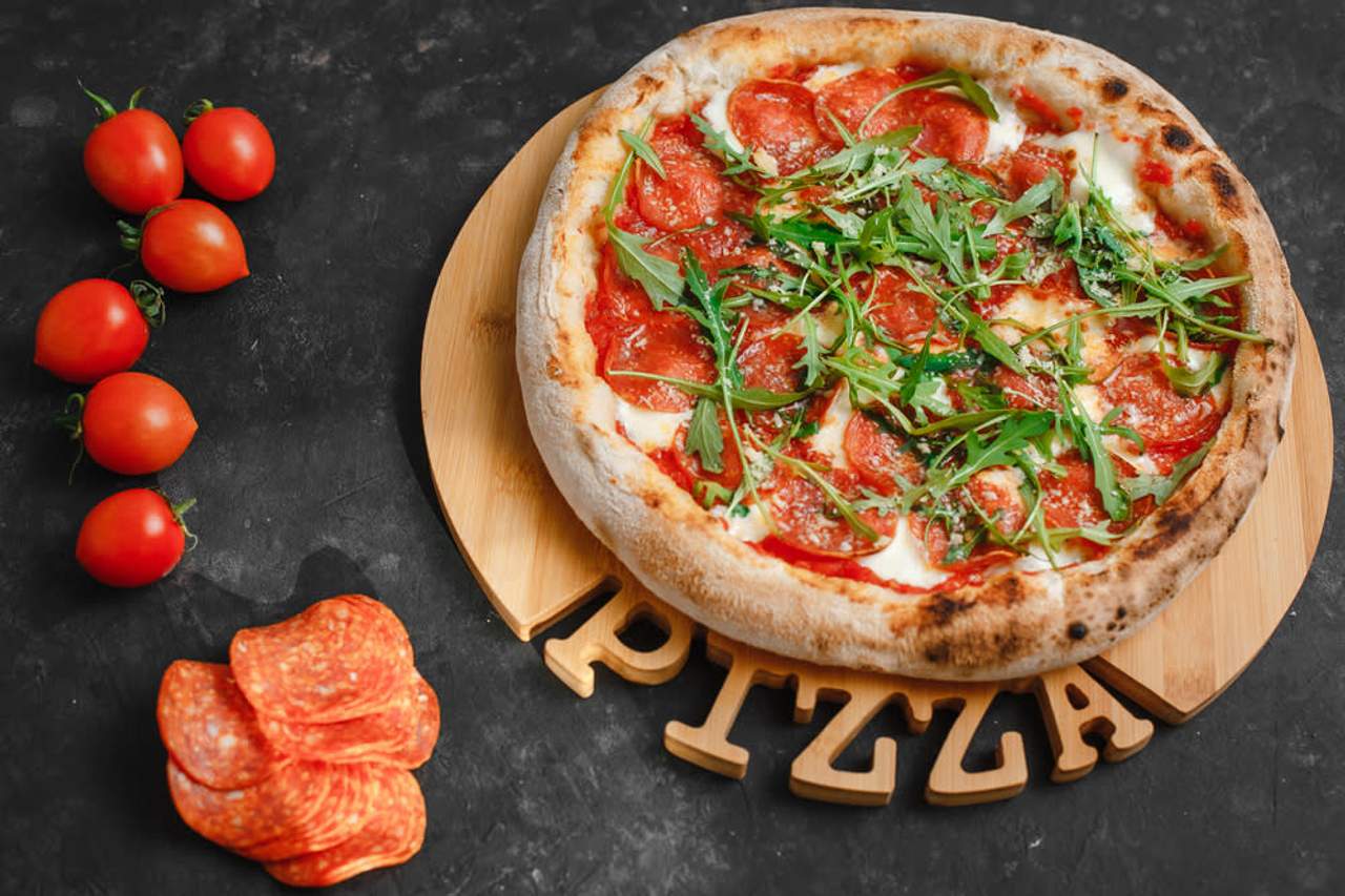 blat, sos pizza, mozzarella, prosciutto, trufe, rucola