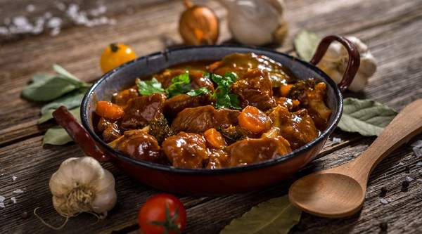 Carne de porc, sare, ceapă, ardei, pasta picanta de ardei, boia, chimen, roșii în bulion, mămăligă, murături - 950 g