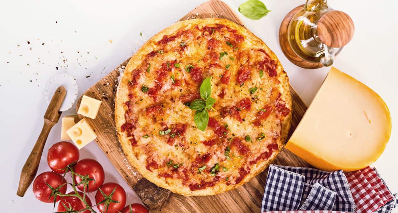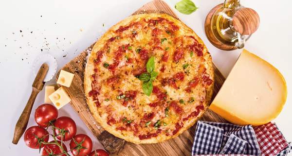 Sos roșii, mozzarella, gorgonzola, parmezan, cașcaval, prosciutto crudo
