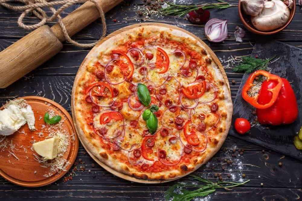 Sos rosii, mozzarella, salam uscat,salam picant, carnati de casa, piept de pui,rosii, ardei gras, masline