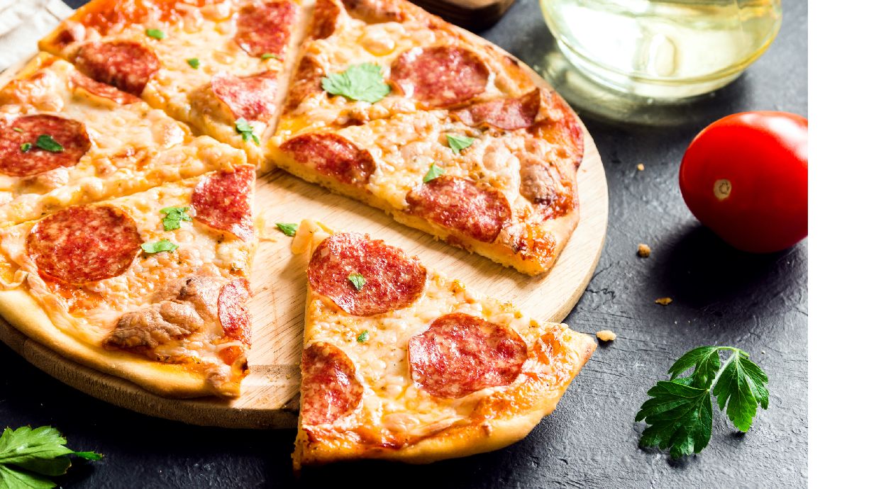 Sauce tomate, double pâtes, mozzarella, jambon, champignon, thon, escalope