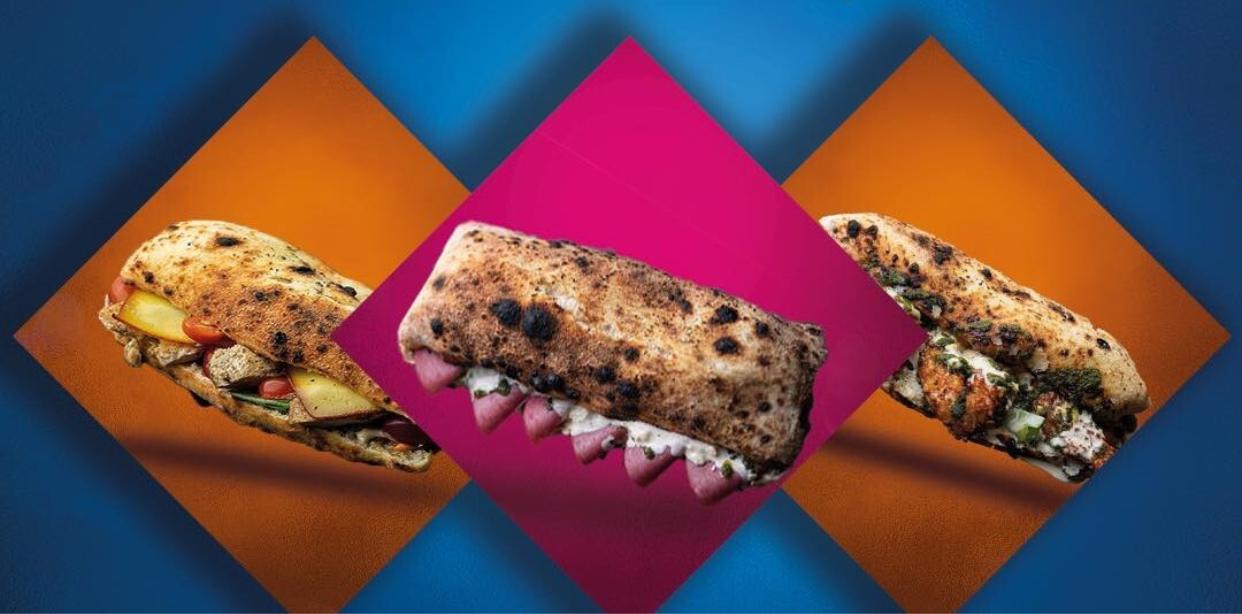Escalope pané, viande haché, laitue, tomate, oignon caramélisés, cheddar, roquette, sauce mexicaine