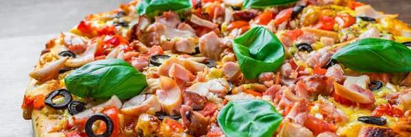 Sauce tomate, mozzarella, champignon, courgette, aubergine, oignon, poivron vert, thon, jambon, olive