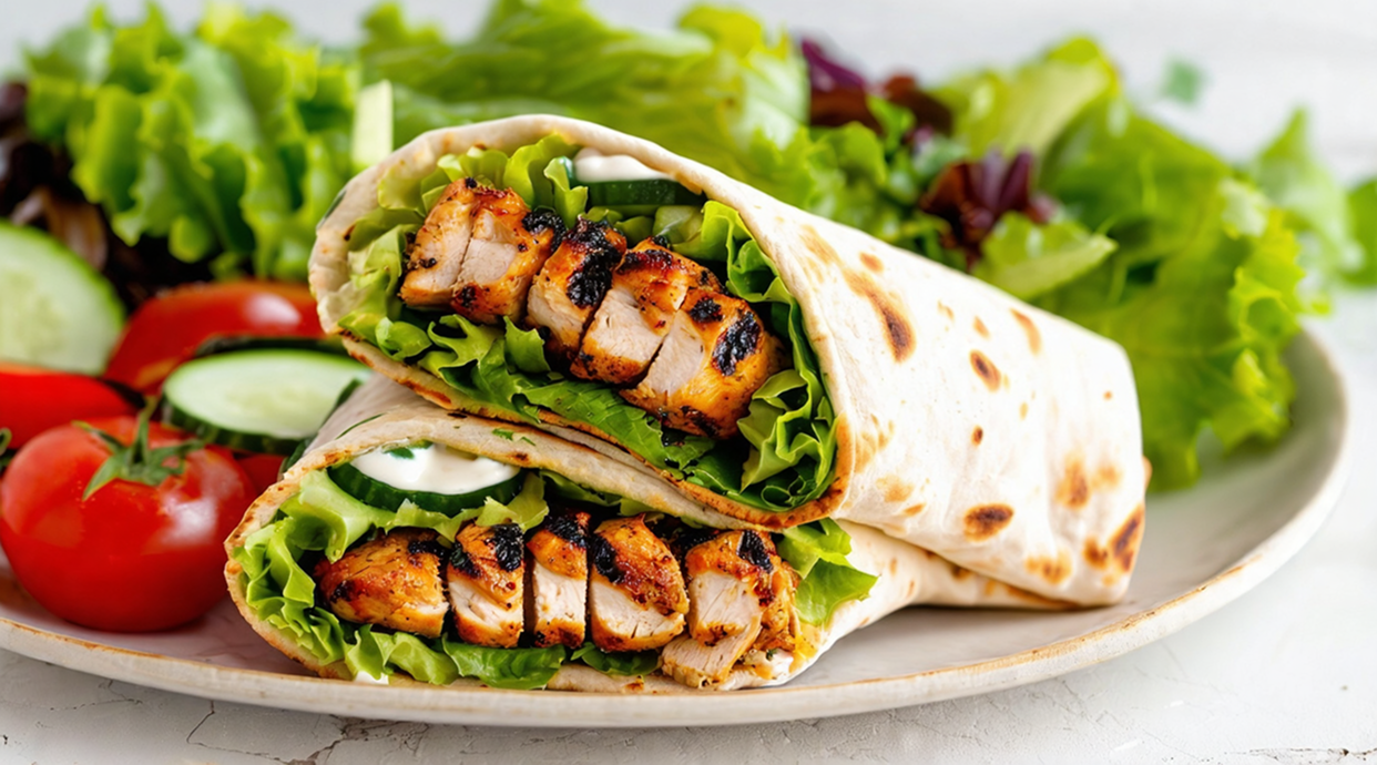 Мікс білої та синьої капусти, морква по-корейськи, свіжий огірок та помідора, маринований перець пероні, куряче м'ясо та соуси (часниковий на основі йогурту та гострий).