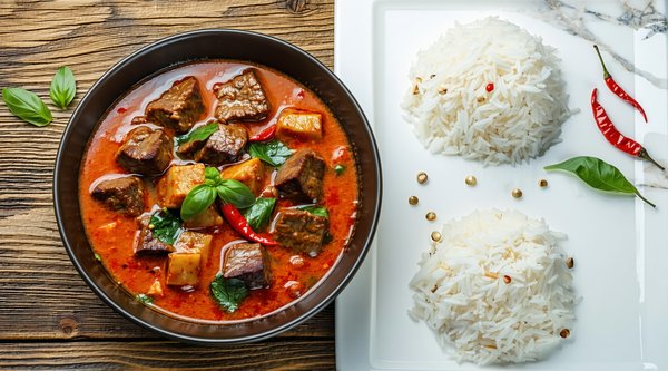 Slow-cooked beef in a savory and aromatic curry served with, Matooke, Posho, Steamed Rice, Sweet potato, Pumpkin, Yam, Steamed greens or Nakati