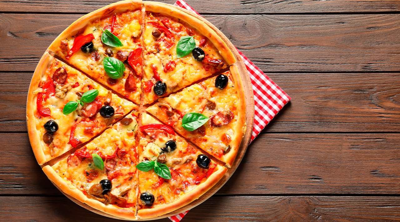 A vegetarian pizza loaded with fresh vegetables and topped with cheese and savory sauce