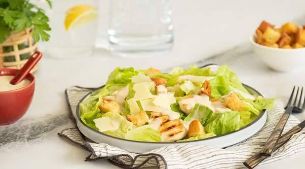 Пилешко филе, марули, лук, домат, бекон, крутони, яйце, дресинг, пармезан (1 броя)