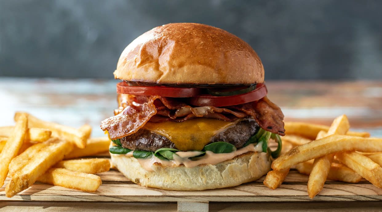 Телешко бургер (2бр), слайс чедър (2бр), бекон, айсберг, домат, лук, пържени картофи, чеснов сос
