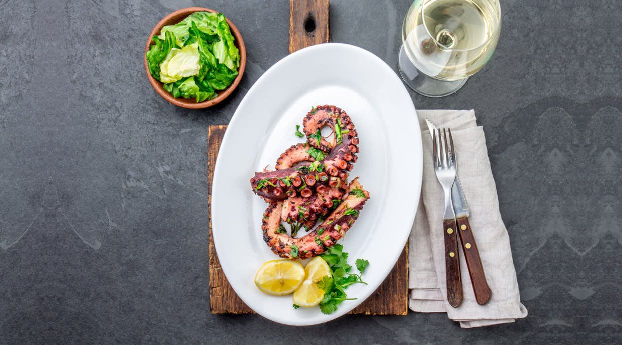 Свеж салатен микс, авокадо, морски дарове, соево-горчичен дресинг