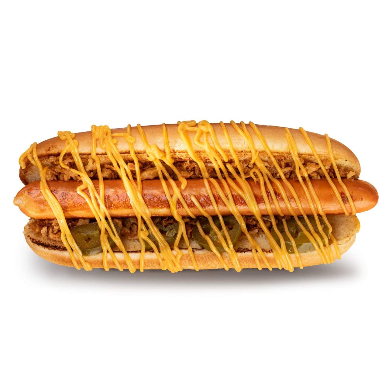 Наденичка от свински бут с чедър в хлебче, с чедър сос, хрупкав печен лук и сос Heinz / Pork sausage paired with cheddar cheese, served in a soft bun, topped with handmade cheddar sauce, crispy roasted onions and a drizzle of Heinz sauce