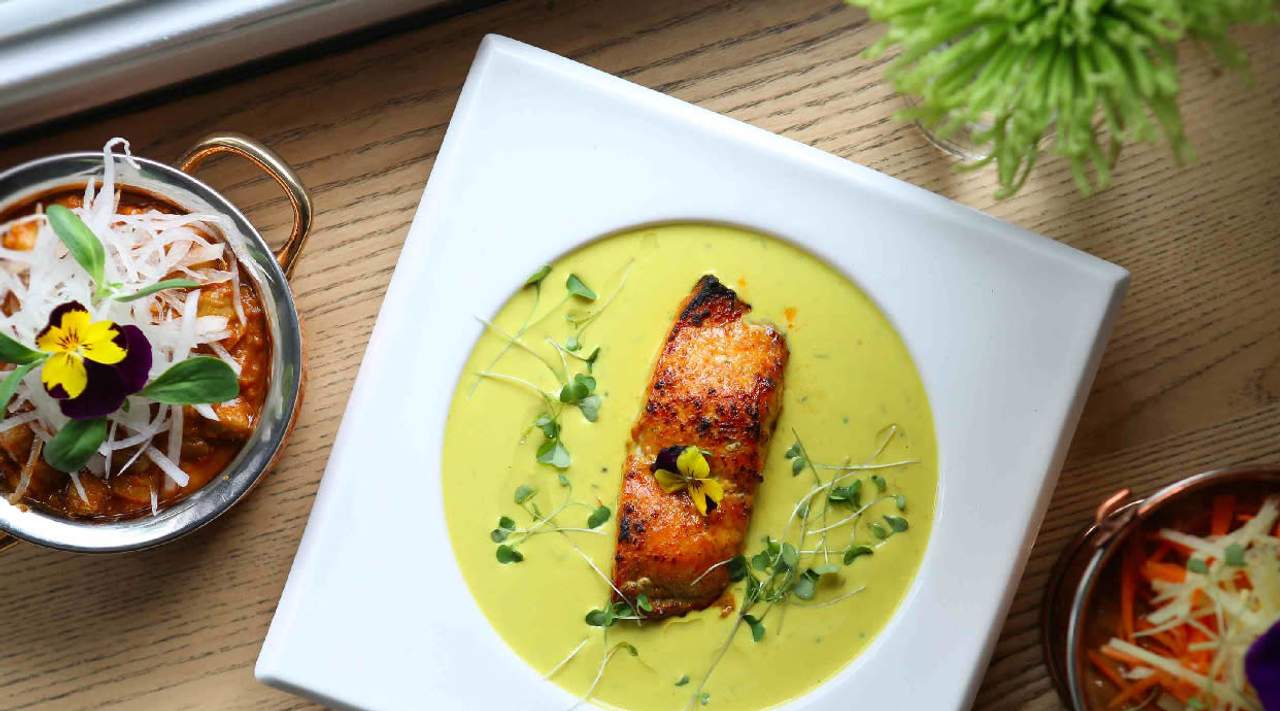 Ястието се сервира със зеленчуков къри сос, много популярно традиционно индийско ястие, приготвено с басмати ориз и специфични подправки