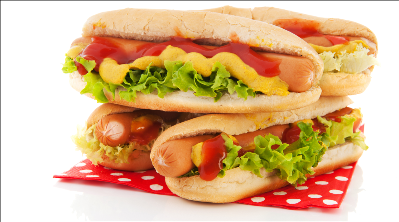 Домашно приготвен бриош със сусам, кетчуп, кренвирш, майонеза, червен лук със сумак и магданоз, домашни пържени картофки